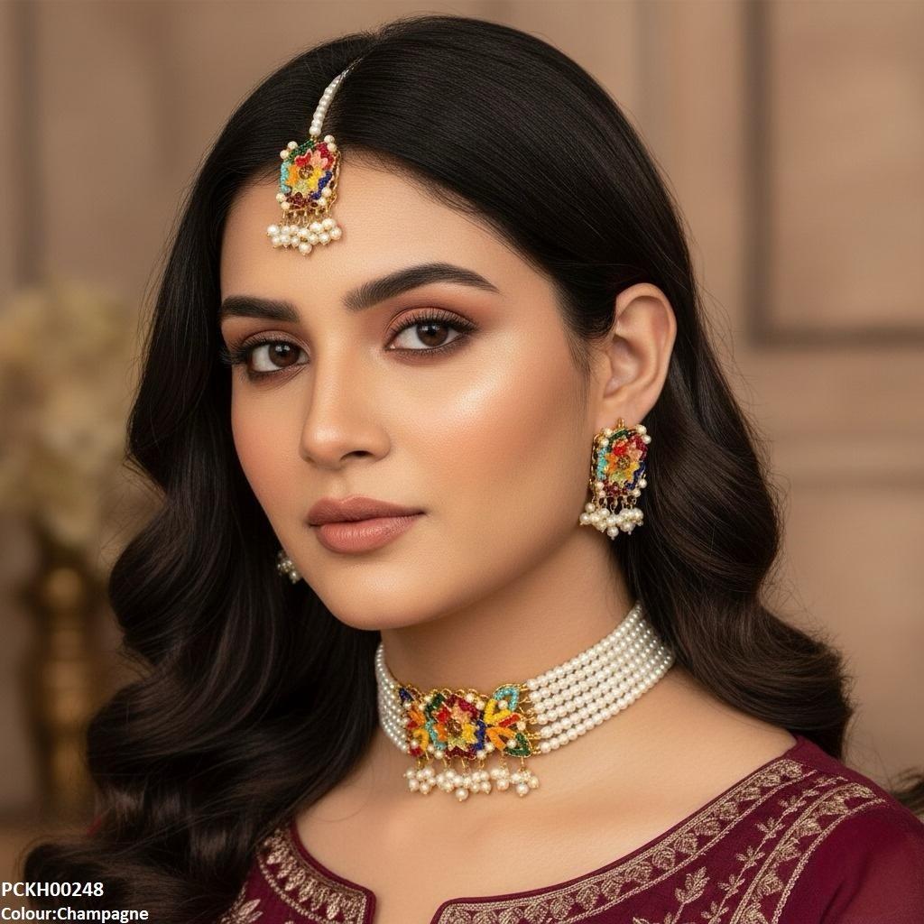 PCKH00248 SDQ Multi Flower Pearl Drop Choker Set - PCKH