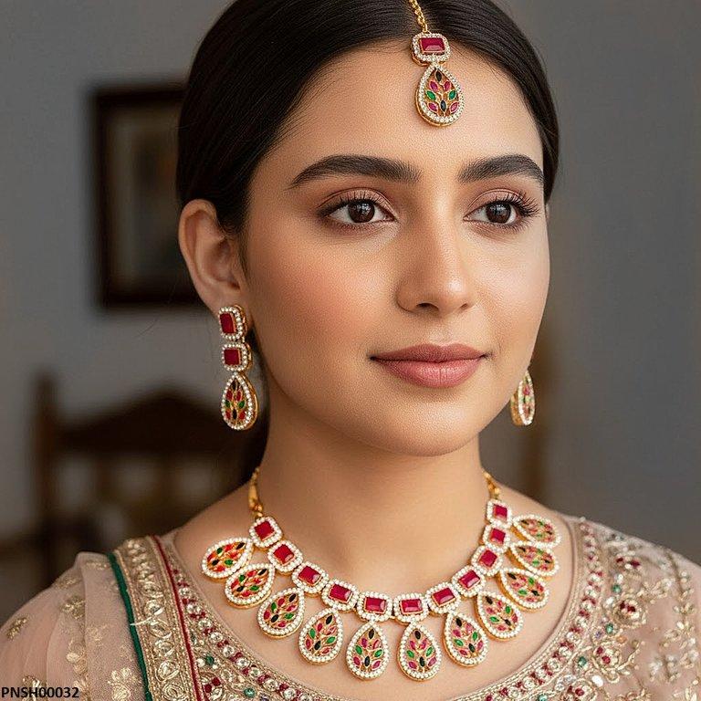Package Included: 1x PCS of Necklace, 1x Pair of Earrings,1x of Bindi